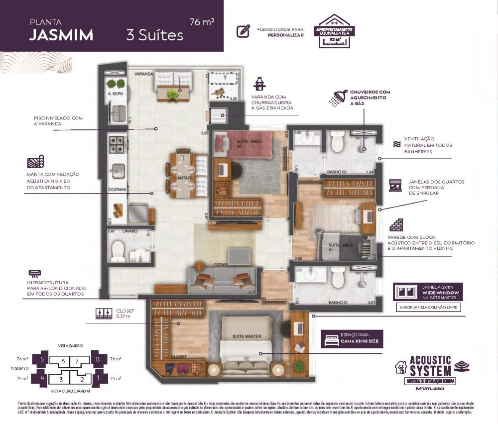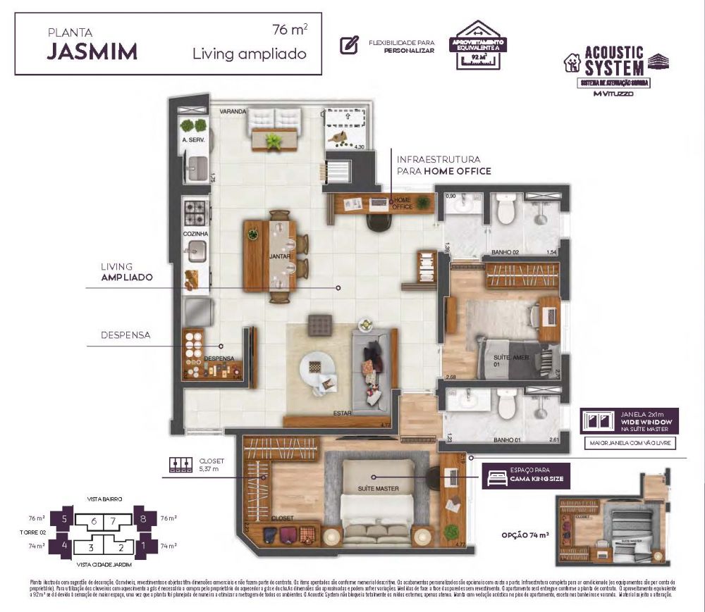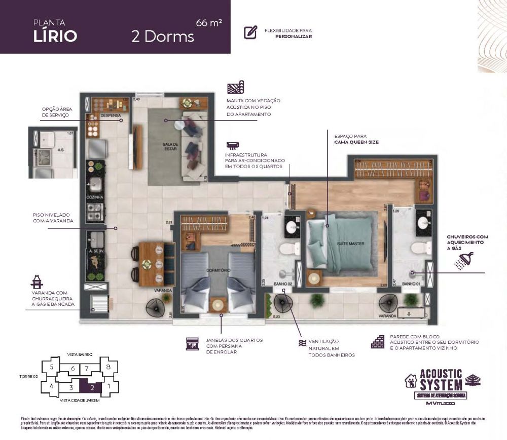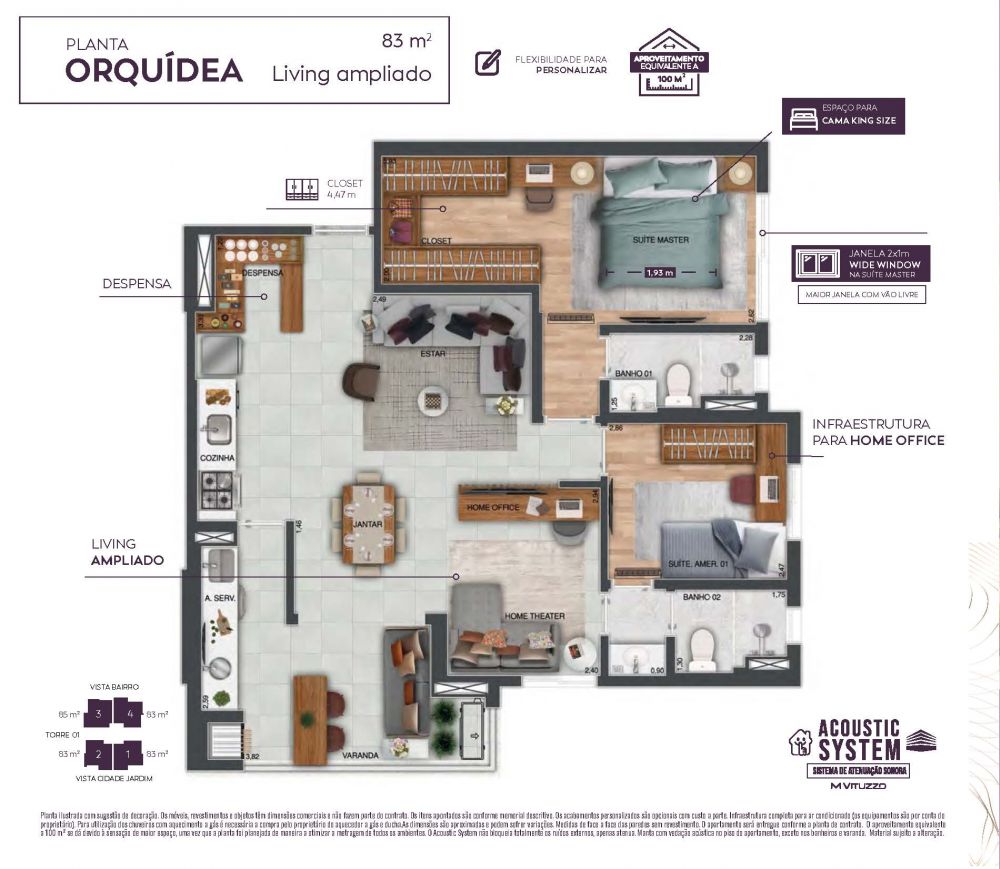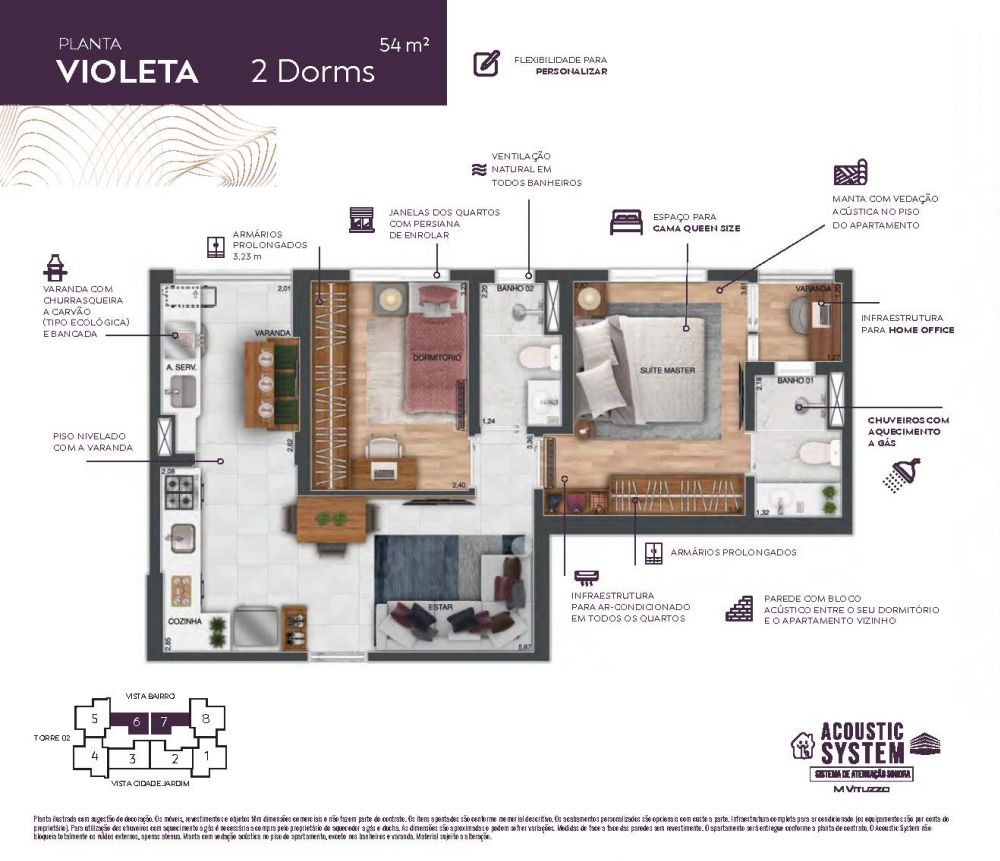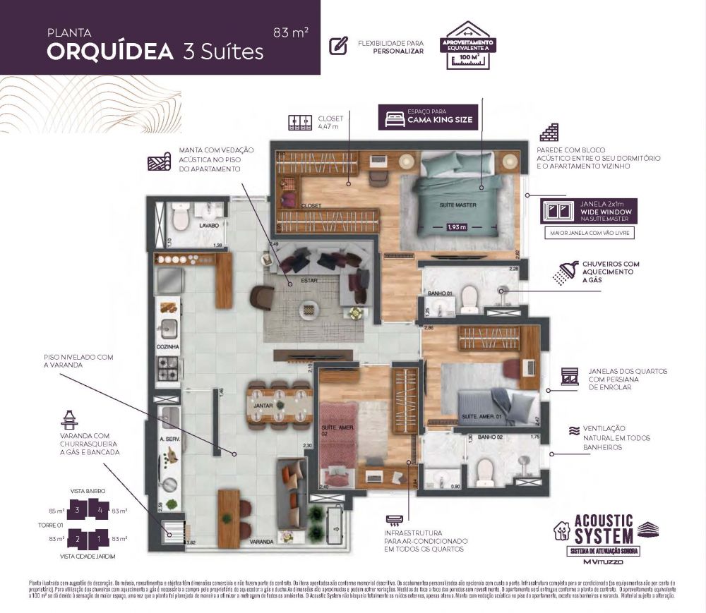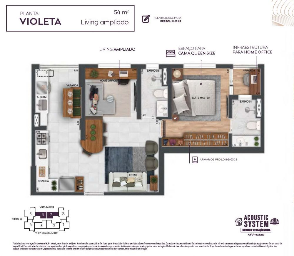 Tipologia das plantas: Violeta 54 m² / Lírio 66 m² e 68 m² / Jasmin 74 m² e 76 m² / Orquídea 83 m² e 85m²